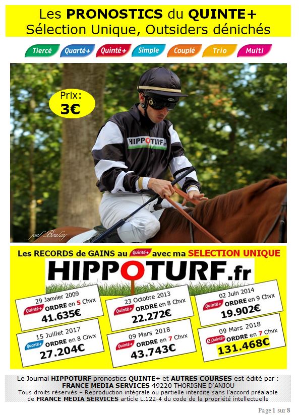 La veille de chaque QUINTE+ à partir de 20h00 ou parfois le matin de la course à partir de 10h00 (en fonction de la réception de mes infos et confirmations) retrouvez ma SELECTION UNIQUE du QUINTE+ avec ma BASE et mon Cheval Repéré ainsi que la rubrique que vous adorez à savoir mes OUTSIDERS dénichés du QUINTE+ sans oublier la SELECTION du FLAMBEUR pour les amateurs de gros rapports ainsi que la SELECTION au féminin de MISS-TURF